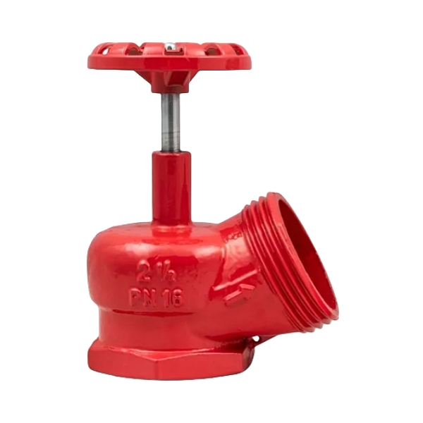 JY品牌45°角截止调节式消防栓角阀是符合PN16标准的消防部件,由球墨铸铁制成,具有2-1/2英寸尺寸、1.6 Mpa工作压力和螺纹出口,专为商业、工业和一般建筑消防栓系统中的可靠水流控制而设计。